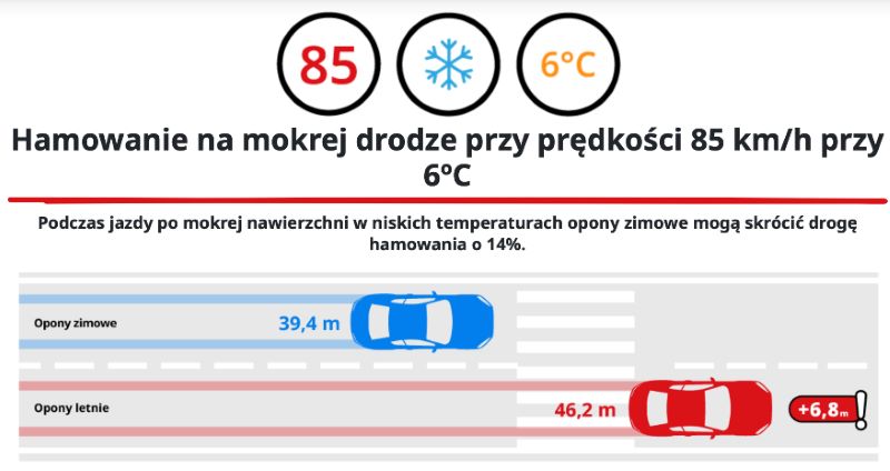 Różnica w drodze hamowanie to 7 metrów na korzyść opon zimowych. To są prawie 2 długości małego SUVa! Zaryzykujcie jazdę na oponach letnich z rodziną lub przyjaciółmi?